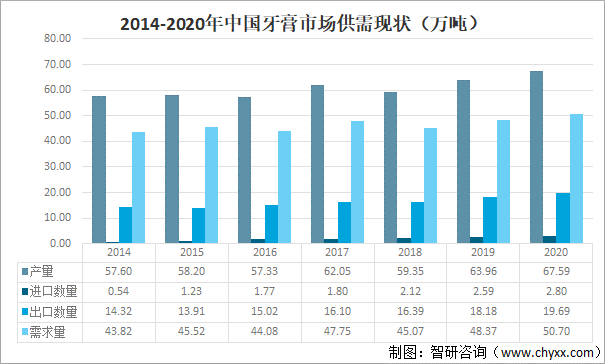 2020年中國牙膏產(chǎn)量平穩(wěn)增長,2020年中國牙膏產(chǎn)量達67.59萬噸,較2019年增加了3.63萬噸,同比增長5.68%,中國牙膏產(chǎn)量大于需求量,部分產(chǎn)品主要用于出口,2020年中國牙膏需求量達50.70萬噸,較2019年增加了2.33萬噸,同比在4.82%,