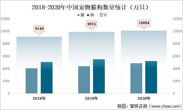 隨著社會(huì)經(jīng)濟(jì)的發(fā)展和城市化進(jìn)程的加快,人民的休閑、消費(fèi)和情感寄托方式也呈現(xiàn)多樣化發(fā)展,寵物已經(jīng)走入尋常百姓家,飼養(yǎng)寵物成為許多家庭的消遣方式,隨著寵物逐漸走進(jìn)家庭,成為許多家庭的新成員,養(yǎng)寵家庭的逐漸增多,2020年中國(guó)寵物貓狗數(shù)量達(dá)10084萬(wàn)只,較2019年增加了169萬(wàn)只,其中貓數(shù)量為4862萬(wàn)只,狗數(shù)量為5222萬(wàn)只。