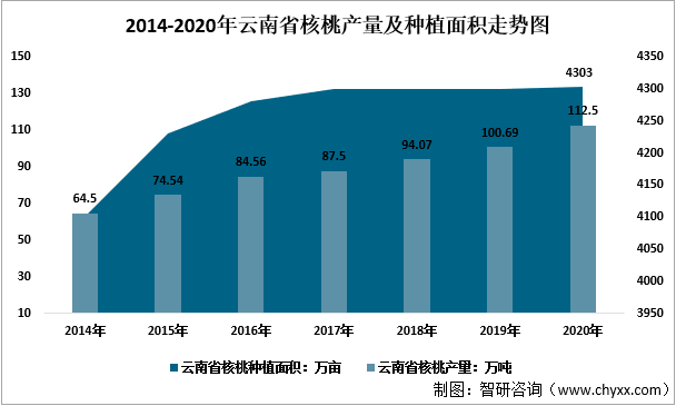 2014-2020年云南省核桃產(chǎn)量及種植面積走勢圖