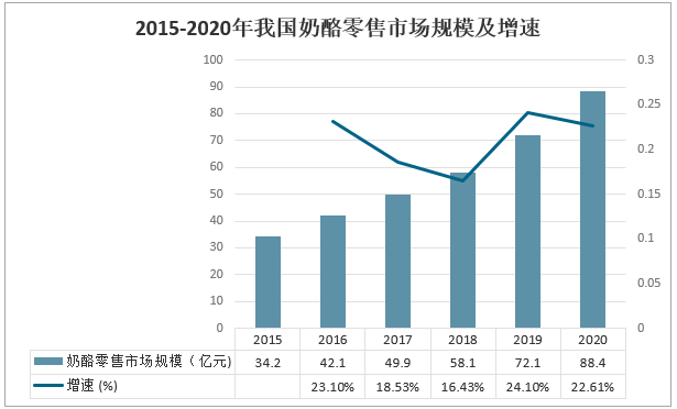 2015-2020年我國奶酪零售市場規模及增速