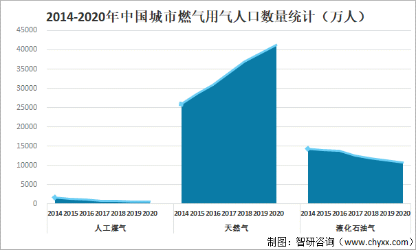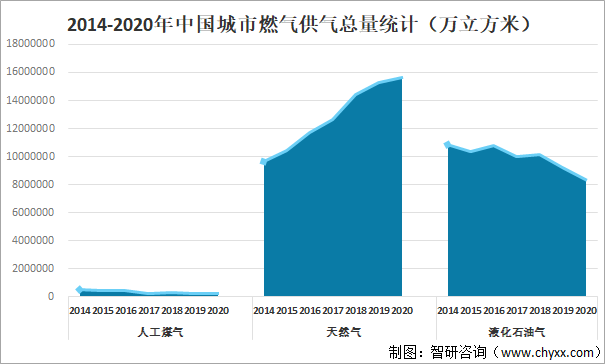 城市燃?xì)庑袠I(yè)的上游為燃?xì)赓Y源的開采,主要包括天然氣開采、煙煤和無煙煤的開采洗選、天然氣的管道運輸?shù)取L烊粴赓Y源和管道運輸?shù)哪芰χ苯記Q定了城市燃?xì)庑袠I(yè)的生產(chǎn)經(jīng)營規(guī)模。城市燃?xì)獾南掠问怯脩舳耍M對象主要包括居民用戶及工商業(yè)用戶等,涉及交通運輸、化工、機(jī)械、餐飲等各行各業(yè)。近年來,城市化和工業(yè)化進(jìn)程的加快,加上節(jié)能減排和消費升級的影響,推動了城市燃?xì)庀M量的快速增長。城市燃?xì)馐浅鞘心茉唇Y(jié)構(gòu)和城市基礎(chǔ)設(shè)施的重要組成部分,它為城市工業(yè)、商業(yè)和居民生活提供優(yōu)質(zhì)氣體燃料,它的發(fā)展在城市現(xiàn)代化中起著極其重要的作用。提高城市燃?xì)饣剑瑢τ谔岣叱鞘芯用竦纳钯|(zhì)量、改善城市環(huán)境、提高能源利用率,具有十分重要的意義,隨著上游輸配管道長度的不斷增加和下游用氣需求量的持續(xù)攀升,我國的城市燃?xì)庑袠I(yè)規(guī)模不斷擴(kuò)大,2020年中國城市人工煤氣供氣總量為231447萬立方米,較2019年減少了45394.21萬立方米;城市天然氣供氣總量為15637020萬立方米,較2019年增加了357610.31萬立方米;城市液化石油氣供氣總量為8337109萬立方米,較2019年減少了890070.33萬立方米。2014-2020年中國城市燃?xì)夤饪偭拷y(tǒng)計