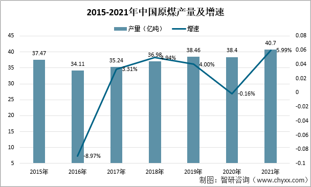2015-2021年中國原煤產(chǎn)量及增速