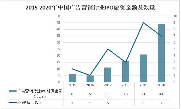 2015-2020年中國廣告營銷行業IPO融資金額及數量