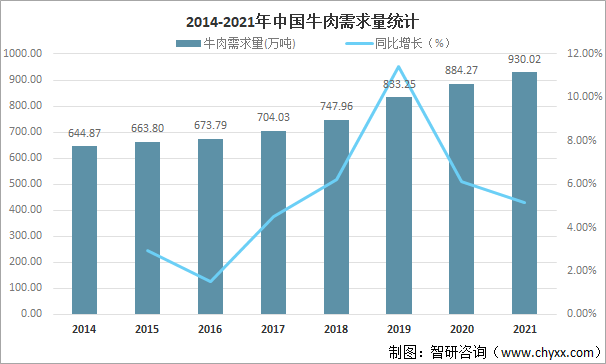 2014-2021年中國牛肉需求量統計
