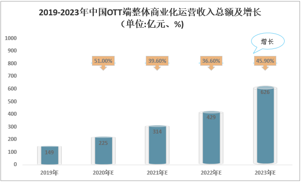 隨著智能電視不斷普及、AI技術的成熟、尤其是5G商用的落地,電視端作為受益者之一,家庭客廳場景也將被重構。外加在OTT的賦能之下,客廳大屏穩坐客廳霸主的地位。2019年中國OTT端整體商業化運營收入總額為149億元;2020年中國OTT端整體商業化運營收入總額約為225億元;預計2021年中國OTT端整體商業化運營收入總額314億元;預計2022年中國OTT端整體商業化運營收入總額429億元;預計2023年中國OTT端整體商業化運營收入總額626億元。