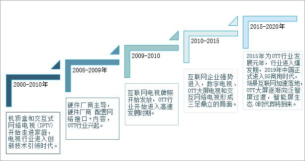 2000年-2009年十年間,機頂盒和交互式網絡電視(IPTV)開始走進家庭,電視行業進入創新技術引領時代。2009年廣電總局開始發放互聯網電視牌照。2010-2015年間,智能電視一體機開始出現,數字電視、OTT大屏電視和交互式網絡電視三足鼎立的局面。2015-2020年是中國OTT行業快速發展階段。