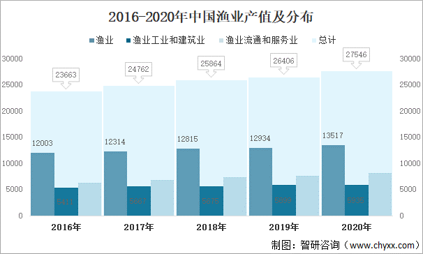 中國漁業總體產業規模龐大,且增長較快,是國民經濟的一個重要部門。2020年中國漁業經濟總產值為27546億元,其中:漁業產值為13517億元,占49.1%;漁業工業和建筑業產值為5935億元,占21.5%;漁業流通和服務業產值為8094億元,占29.4%,