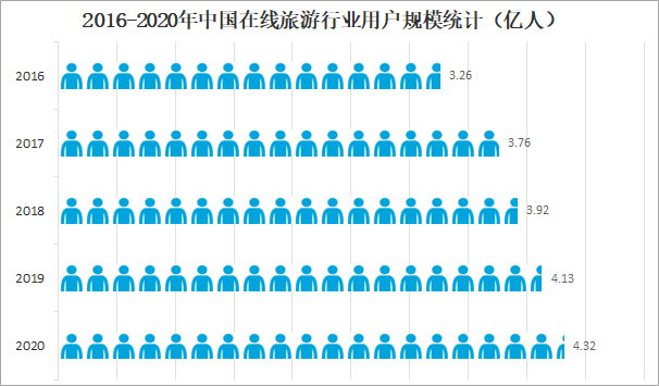 隨著人們生活水平的提高,旅游已經成為大眾日常休閑的重要方式。品質游、定制游、跨境游等受到越來越多游客的青睞。消費者的巨大需求,促進了旅游市場的快速發展。互聯網和旅游業的有機結合催生了在線旅游,在線旅游以網絡開放為前提,在旅游業經營行為中應用互聯網、移動電子商務等高新技術,從而實現一種以互聯網為核心、包括在線旅游咨詢,在線訂購與交易、電子導游、旅游定位系統、網上虛擬實景旅游等主要內容的一種全新旅游業態,近年來中國在線旅游行業用戶規模快速增長,2020年中國在線旅游行業用戶規模達4.32億人,較2019年增加了0.19億人,同比增長4.6%。2016-2020年中國在線旅游行業用戶規模統計
