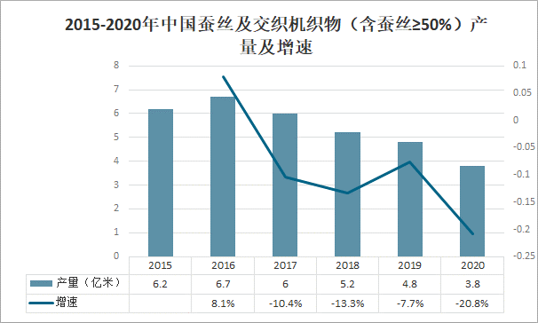 2015-2020年中國蠶絲及交織機織物(含蠶絲≥50%)產量及增速