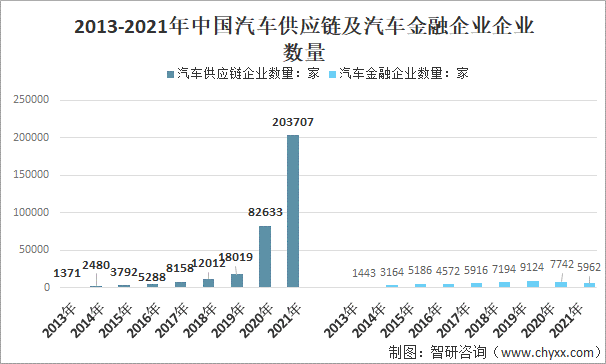隨著各項(xiàng)金融監(jiān)管政策的落地,市場發(fā)展?jié)摿M(jìn)一步激活,汽車金融仍然吸引了相關(guān)企業(yè)加速布局,汽車金融行業(yè)正在快速發(fā)展,汽車供應(yīng)鏈及汽車金融企業(yè)數(shù)量不斷增加,資產(chǎn)規(guī)模和利潤水平大大提高,市場參與者日益多元化。截止2021年12有10日,中國汽車供應(yīng)鏈企業(yè)數(shù)量203707家,汽車金融企業(yè)數(shù)量5962家。