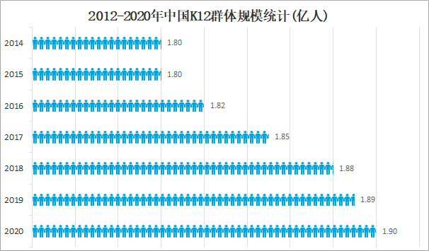 中國K12群體主要為6-18歲的青少兒人口,隨著二胎政策的落實,K12群體規模將進一步擴大,2020年中國K12群體規模達1.90億人,較2019年增加了0.01億人,同比增長0.5%,適齡人口規模的不斷增長,為K12在線英語教育的發展提供了有力的保障。