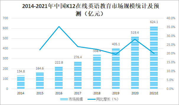 隨著互聯網技術的不斷發展,“互聯網+”的紅利自然不能略過教育行業,人們已經不再滿足線下優質的受教育需求。特別是二胎政策的開放,升學壓力持續增大,滿足用戶碎片化學習K12在線教育開始受到廣泛關注,行業規模也在持續擴大,2020年新冠疫情使得全國中小學生普遍在家通過互聯網上課,趁著這股東風,我國K12在線英語教育市場規模逆勢增長,2020年中國K12在線英語教育市場規模達519.4億元,較2019年增加了114.30億元,同比增長28.2%,預計2021年中國K12在線英語教育市場規模將達到624.1億元。