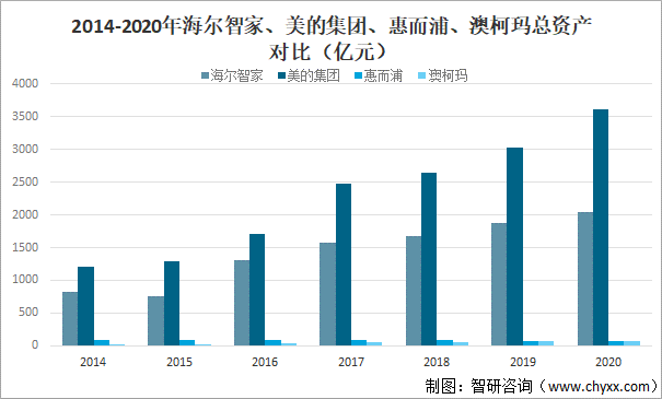 2014-2020年海爾智家、美的集團、惠而浦、澳柯瑪總資產對比(億元)