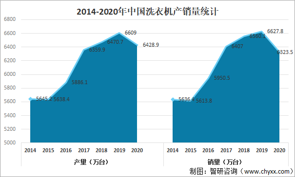 中國洗衣機業經過多年發展,已成為一個較成熟的產業,隨著科技的不斷發展,洗衣機早已成為必備電器出現在了每個家庭的日常生活中,市場發展趨于穩定狀態,自2016年起中國洗衣機產量逐年攀升,2019年中國洗衣機產量達6609萬臺,較2018年增加了138.30萬臺,同比增長2.14%,2020年受新冠肺炎疫情影響,中國洗衣機產量有所下滑,2020年中國洗衣機產量為6428.9萬臺,較2019年減少了180.10萬臺,同比減少2.73%,在中國洗衣機產量減少的同時,銷量也在減少,2020年中國洗衣機銷量為6323.5萬臺,較2019年減少了304.30萬臺,同比減少4.59%。2014-2020年中國洗衣機產銷量統計