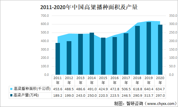 隨著20世紀60年代以來全球范圍綠色革命帶來的小麥、玉米、水稻等主糧全面高產以及20世紀80年代中國改革開放后,伴隨著國民經濟的增長和人民生活水平的提高,高粱的主要用途逐步從食用轉變為釀造原料,導致中國高粱種植面積逐步下降,成為重要的雜糧作物。但近年來,在中國酒業的拉動下,高粱種植迅猛發展。2015年,中國高粱種植面積為424.9千公頃,產量為220.3萬噸;到2020年中國高粱種植面積達634.7千公頃,產量為297.0萬噸。