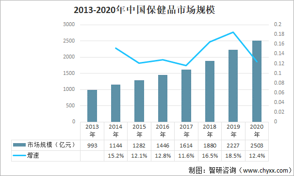 伴隨著國民收入水平的提升,居民自身健康管理意識的不斷增強,我國消費者對保健食品的需求將持續增長,我國保健食品市場規模將進一步擴大。中國保健品行業市場規模由2013年的993億元增加至2020年的2503億元,年復合增長率為14%。