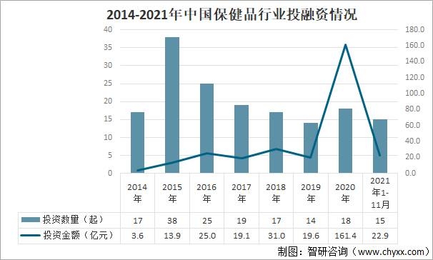 保健品是中國大陸的一般稱呼,在國外包括港澳臺地區一般稱之為:膳食補充劑。2020年突如其來的新冠疫情,深刻地改變著國人的健康觀,帶來后疫情時代營養健康相關產品市場需求的增長提速。保健品賽道投資熱度突飛猛進,投資規模達161.4億元,較2019年增長了700%以上;2021年隨著疫情的有效控制,行業投資逐漸回歸冷靜。2014-2021年中國保健品行業投融資情況