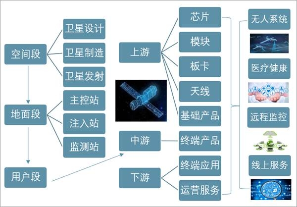 我國衛星導航產業鏈大體可以分為:上游、中游和下游。上游基礎產品研制、生產及銷售環節,是產業自主可控的關鍵,主要包括芯片、模塊、板卡、天線等;中游是當前產業發展的重點環節,主要包括各類終端集成產品和系統集成產品研制、生產及銷售等;下游是基于各種技術和產品的應用及運營服務環節,主要包括無人系統、醫療健康、防疫消殺、遠程監控、線上服務等。衛星導航產業鏈