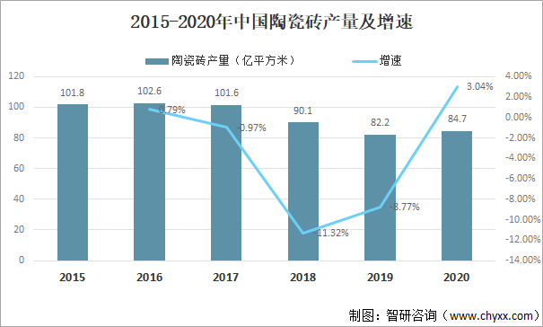 目前我國是全球上最大的瓷磚生產國、消費國及出口國,2020年中國陶瓷磚產量約為84.7億平方米,同比增長3.04%。