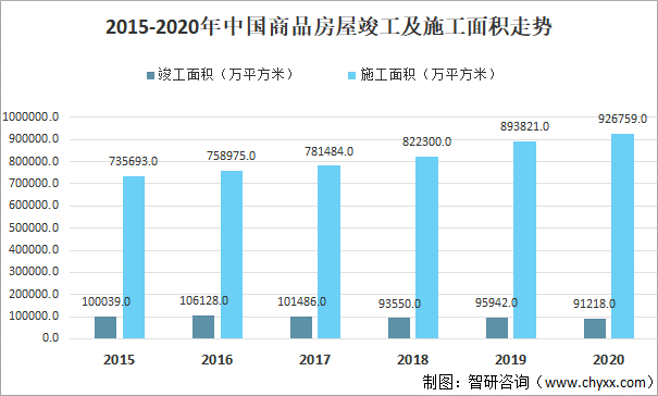 近年來隨著我國城鎮化水平的不斷提高,城市面積規模不斷擴張,建筑市場也在不斷擴大。2020年中國商品房屋竣工為91218萬平方米,同比下降4.9%;中國商品房屋施工面積為926759萬平方米,同比增長3.7%。2015-2020年中國商品房屋竣工及施工面積走勢