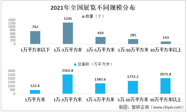 2021年,在中國境內舉辦的所有規模展覽中,10萬平方米以上規模展覽數量及面積占比均最高,數量達1245個,面積為2561.8萬平方米。