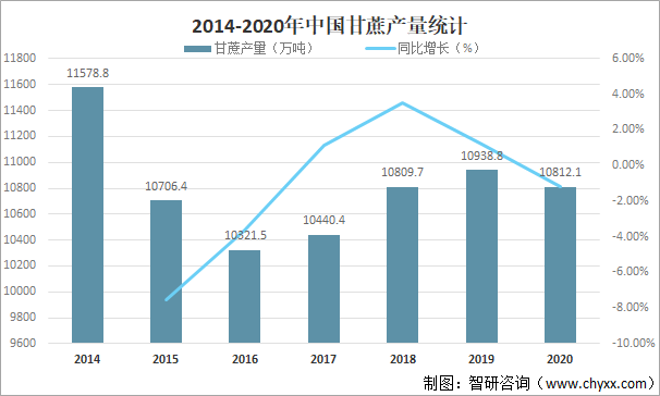 隨著中國甘蔗播種面積的增加,產量也隨之增長,2019年中國甘蔗產量達10938.8萬噸,較2018年增加了129.10萬噸,同比增長1.19%,2020年較2019年小幅減少,2020年中國甘蔗產量為10812.1萬噸,較2019年減少了126.70萬噸,同比減少1.16%。