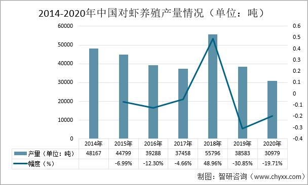 據農業農村部漁業統計,2018-2020年中國對蝦養殖產量大幅度下降。從2018年中國對蝦養殖產量的55796噸到2020年的30979噸,兩年間產量減少了24817噸,2019年養殖產量較2018年同比下降了30.85%。2020年養殖產量為30979噸,較2019年減少了7604噸,同比下降了19.71%。養殖面積減少和蝦苗質量下降的下降是導致中國對蝦產量下降的主要因素。