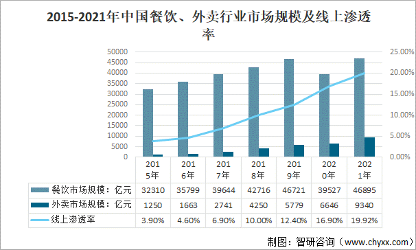 2015-2021年中國餐飲、外賣行業(yè)市場規(guī)模及線上滲透率