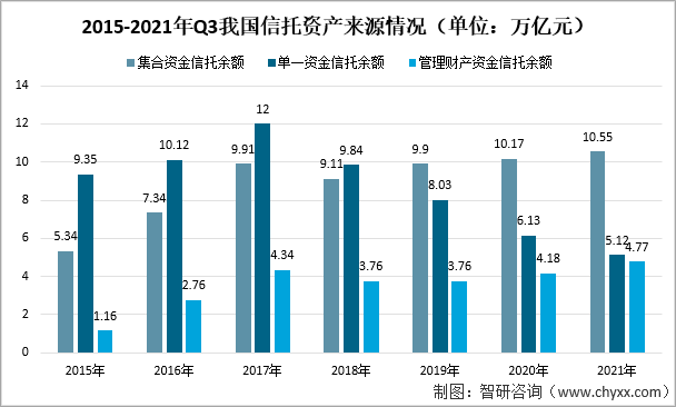 2015-2021年Q3我國信托資產來源情況(單位:萬億元)