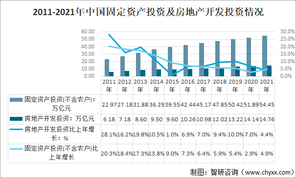 2011-2021年中國(guó)固定資產(chǎn)投資及房地產(chǎn)開(kāi)發(fā)投資情況