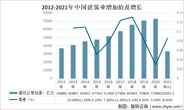 建筑業(yè)是國(guó)民經(jīng)濟(jì)的支柱產(chǎn)業(yè),對(duì)促進(jìn)全市經(jīng)濟(jì)社會(huì)向好發(fā)展做出了積極貢獻(xiàn)。2012年以來(lái),中國(guó)建筑業(yè)增加值連續(xù)八年保持增長(zhǎng),2020年中國(guó)建筑業(yè)增加值達(dá)到72996億元,比2019年增長(zhǎng)3.0%,盡管“十四五”期間,中國(guó)建筑市場(chǎng)將從中速增長(zhǎng)期進(jìn)入中低速發(fā)展期,但中國(guó)仍擁有全球最大的建設(shè)規(guī)模,建筑業(yè)增加值增勢(shì)依然喜人,2021年上半年,中國(guó)筑業(yè)增加值33335.2億元,同比增長(zhǎng)8.6%。