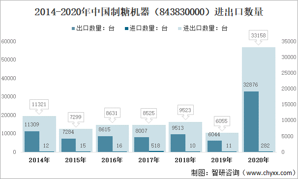 近年來,我國的制糖企業規模逐漸擴大,制糖機器的機械化、自動化程度也逐漸提高,大部分糖廠的原糖與產品糖分開加工,不僅減少了設備投入和勞力成本,還降低了產品含雜率。中國早已成為世界最大的機械設備生產國,其產量相當于美國、德國、日本和意大利產量的總和,制糖機器也不例外。2014年以來,中國糖機器(843830000)出口數量遠大于進口數量,2020年,中國制糖機器進出口數量33158臺,較2019年增長27103臺,其中:出口數量32876臺,進口數量282臺。