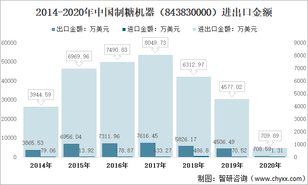 從中國制糖機器(843830000)進出口金額來看,2020年中國制糖機器進出口金額709.89萬美元,較2019年下降3867.13萬美元,其中:出口金額708.59萬美元,進口金額1.31萬美元。