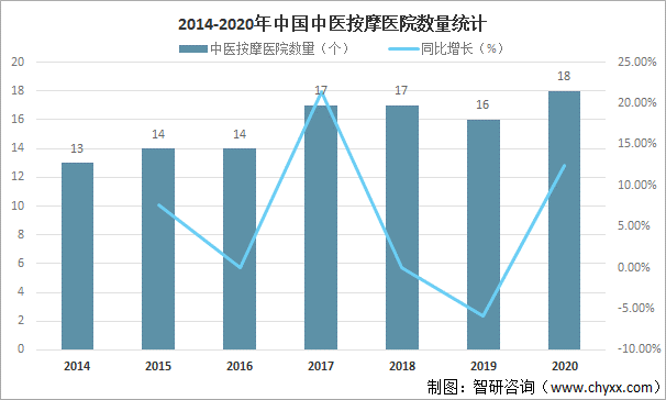 隨著中醫按摩市場的不斷發展,中國中醫按摩醫院快速發展,2020年中國中醫按摩醫院數量達18個,較2019年增加了2個,同比增長12.50%。