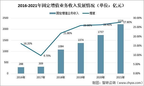 云計算、大數據等新興業務發展加速,2021年實現相關業務收入2225億元,比上年增長27.8%,在電信業務收入中占比由上年的12.8%提升至15.2%。其中,數據中心、云計算、大數據業務比上年分別增長18.4%、91.5%和35.5%。2016-2021年固定增值業務收入發展情況(單位:億元)