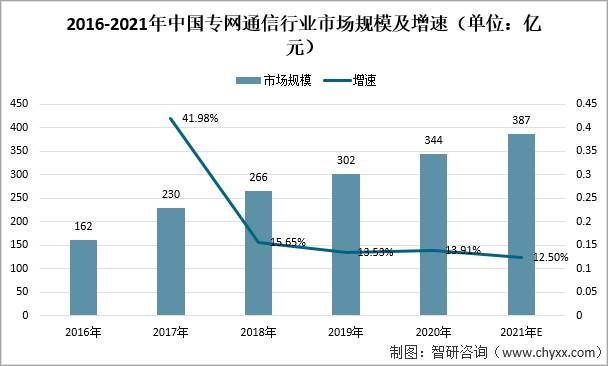 2016-2021年中國專網通信行業市場規模及增速(單位:億元)
