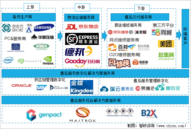 中國第三方售后服務行業上游有備件生產商,中游是物流倉儲服務商,下游是售后交付服務商,終端是客戶。