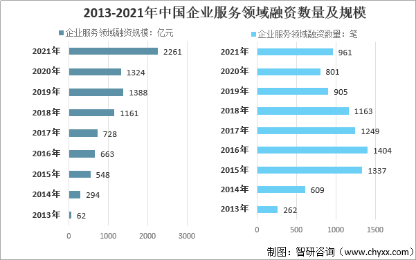 近年來,隨著人口紅利的消退及信息技術的快速發展,企業的服務需求快速增長。2013年至2016期間,企業服務領域投融資較為活躍,但近年來,企業服務領域平均單筆融資金額不斷上升,2021年中國企業服務領域融資數量961筆,較2020年增長16筆;融資規模2261億元,較2020年增長937億元;2021年企業服務領域平均單筆融資規模2.35億元,較2020年增長0.7億元。