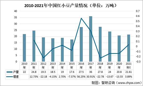 中國是世界上紅小豆產量最多的國家,據國家統計局數據顯示:中國紅小豆2020年產量為20.8萬噸,同比2019年下降了13.33%。2021年因市場行情較好,中國紅小豆的種植面積開始增加,產量同比也有提升。2021年中國紅小豆的產量預計為21.61萬噸,比2020年增漲3.89%。