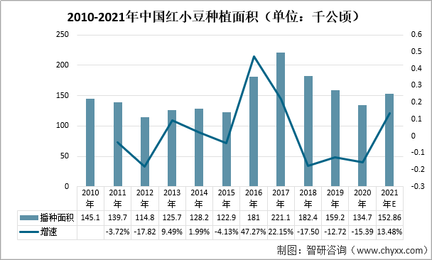 2010-2021年中國紅小豆種植面積(單位:千公頃)