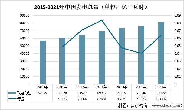 隨著電網工程建設的增加,我國發電總量也在穩定增漲。2021年全國發電總量為81122億千瓦時,同比2020年增漲6.41%。2020年全國發電總量為76236億千瓦時,同比增漲4.05%。