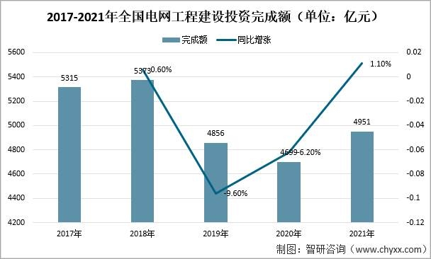 國家仍在大力發展電網工程,2021年我國電網工程建設投資完成額為4951億元,同比增漲1.10%。2020年我國電網工程建設投資完成額為4699億元,同比增漲6.20%。