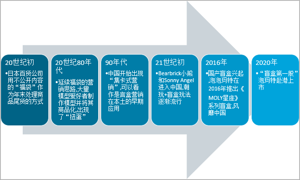 ldquo;盲盒”,顧名思義,就是在非透明的包裝中加入物品,借由消費者的“賭博”心理而實現商品的售出。盲盒起源于日本的“福袋”,最開始是超市為了處理滯銷的貨物而將其放入不透明的袋子中,通過塑造不確定感來吸引客戶的購買。這時候的福袋中往往是袋內物品的實際價值高于福袋的定價。隨著日本二次元的興起,包含各種手辦玩偶的“扭蛋機”也隨之出現。到20世紀90年代,這一類“盲盒”概念開始以集卡的形式出現在我國,尤其在學生群體中引起一陣消費熱潮。