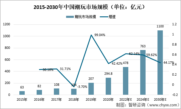 國內潮玩市場的規模從2015年的63億元,增加到了2020年的294.8億元,復合年增長率高達36%。預計市場規模在2024年會達到763億元,2030年將突破1100億元。