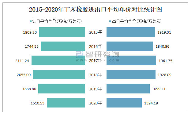 2015-2020年丁苯橡膠進出口平均單價對比統計圖