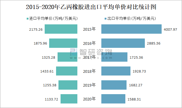 2015-2020年乙丙橡膠進出口平均單價對比統(tǒng)計圖