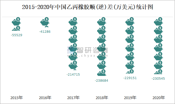 2015-2020年中國乙丙橡膠順(逆)差(萬美元)統(tǒng)計圖