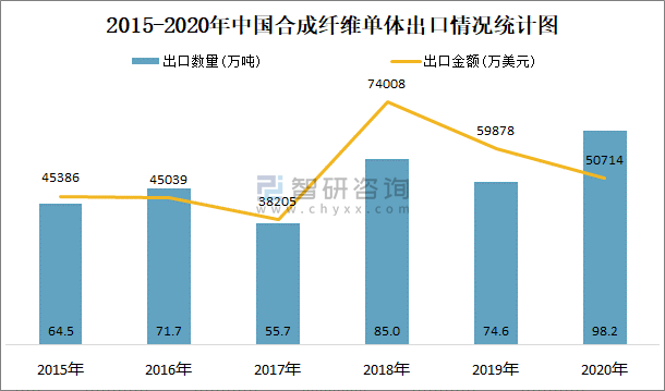 2015-2020年中國合成纖維單體出口情況統計圖