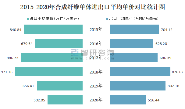 2015-2020年合成纖維單體進出口平均單價對比統計圖