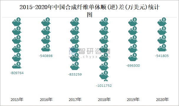 2015-2020年中國合成纖維單體順(逆)差(萬美元)統計圖